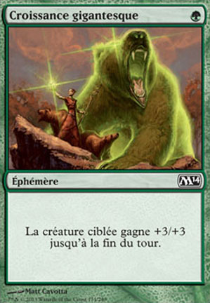 Supposons par exemple, que vous attaquez avec une petite créature et que votre adversaire dispose d’une grosse créature pour la bloquer. Normalement, la grosse créature devrait anéantir votre attaquant plus faible. Mais vous avez un atout dans votre manche : un sort d'éphémère appelé Croissance gigantesque (la créature ciblée gagne +3/+3 jusqu'à la fin du tour). Comme son nom l’indique, ce sort transforme votre petit attaquant en un véritable danger ; la créature bloqueuse de votre adversaire a désormais de gros ennuis !