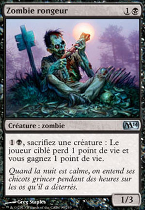 Quel que soit le genre de deck que vous voulez construire, il est toujours conseillé de chercher des cartes qui se combinent bien. Il existe des tonnes de cartes différentes et la plupart d'entre elles ont des capacités bien plus puissantes une fois combinées qu’employées seules. Voyons deux cartes de créatures et la façon dont elles interagissent. La première est le Zombie rongeur. Le Zombie rongeur a une capacité assez puissante. Il maintient votre total de points de vie à un niveau raisonnablement élevé, il ronge le total de points de vie de votre adversaire et, en général, les créatures que vous sacrifiez sont de toute façon sur le point de mourir.